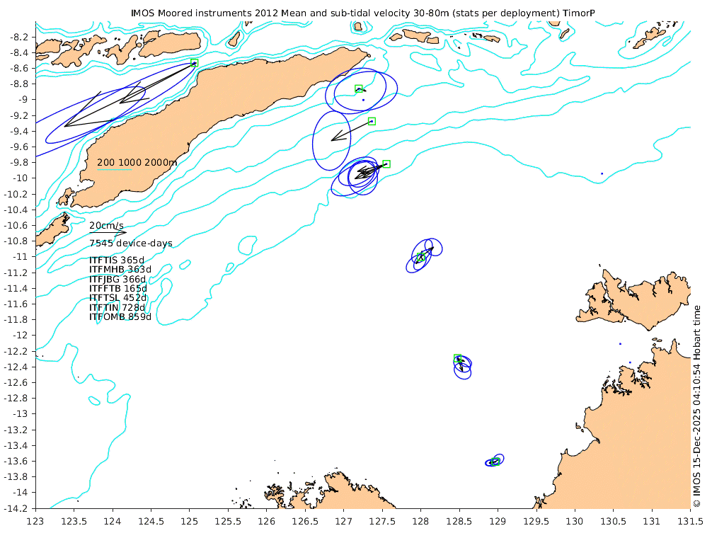 These maps show some basic analyses of the velocity data: mean (all-time in black and seasonal in colour) and sub-tidal variance for several layers and time-windows, and tidal harmonics for the depth-average velocity using the whole record. Click through to see more detailed plots of the selected dataset or to download those data from the AODN thredds server.