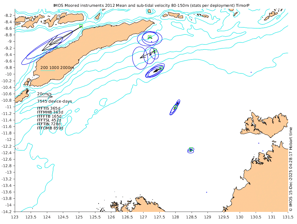 These maps show some basic analyses of the velocity data: mean (all-time in black and seasonal in colour) and sub-tidal variance for several layers and time-windows, and tidal harmonics for the depth-average velocity using the whole record. Click through to see more detailed plots of the selected dataset or to download those data from the AODN thredds server.