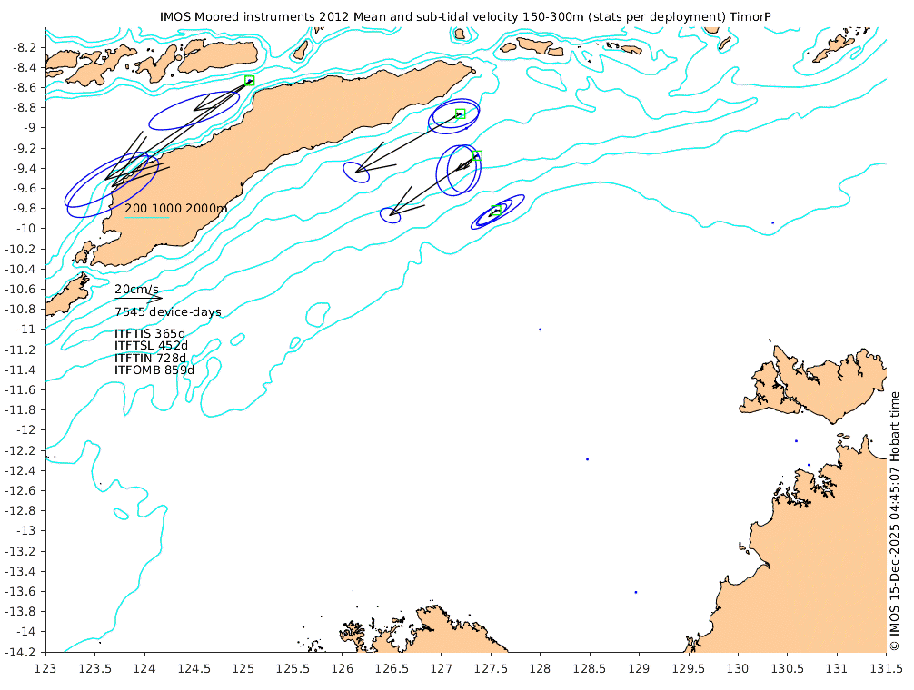 These maps show some basic analyses of the velocity data: mean (all-time in black and seasonal in colour) and sub-tidal variance for several layers and time-windows, and tidal harmonics for the depth-average velocity using the whole record. Click through to see more detailed plots of the selected dataset or to download those data from the AODN thredds server.