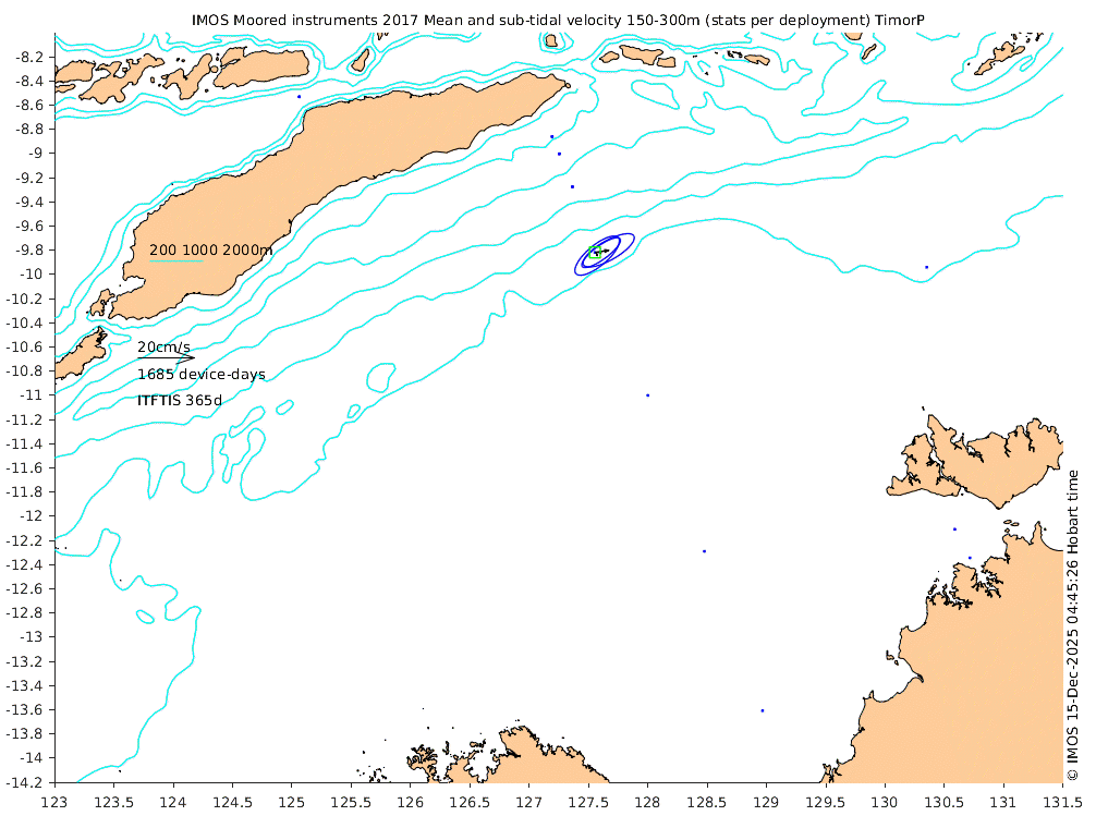 These maps show some basic analyses of the velocity data: mean (all-time in black and seasonal in colour) and sub-tidal variance for several layers and time-windows, and tidal harmonics for the depth-average velocity using the whole record. Click through to see more detailed plots of the selected dataset or to download those data from the AODN thredds server.
