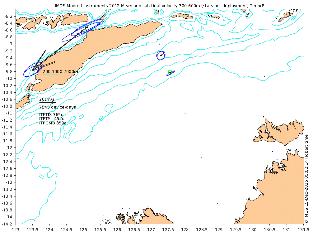 These maps show some basic analyses of the velocity data: mean (all-time in black and seasonal in colour) and sub-tidal variance for several layers and time-windows, and tidal harmonics for the depth-average velocity using the whole record. Click through to see more detailed plots of the selected dataset or to download those data from the AODN thredds server.