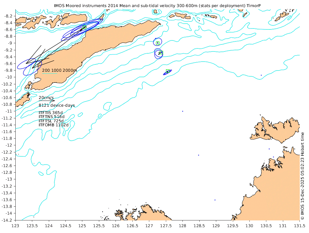 These maps show some basic analyses of the velocity data: mean (all-time in black and seasonal in colour) and sub-tidal variance for several layers and time-windows, and tidal harmonics for the depth-average velocity using the whole record. Click through to see more detailed plots of the selected dataset or to download those data from the AODN thredds server.