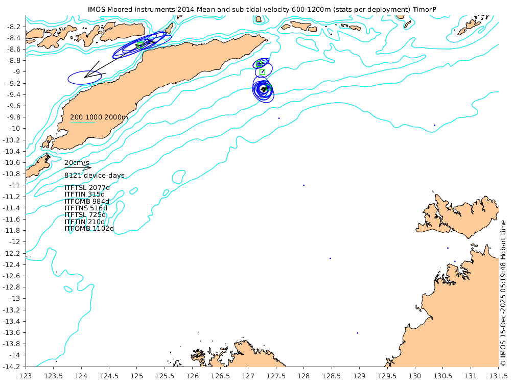 These maps show some basic analyses of the velocity data: mean (all-time in black and seasonal in colour) and sub-tidal variance for several layers and time-windows, and tidal harmonics for the depth-average velocity using the whole record. Click through to see more detailed plots of the selected dataset or to download those data from the AODN thredds server.