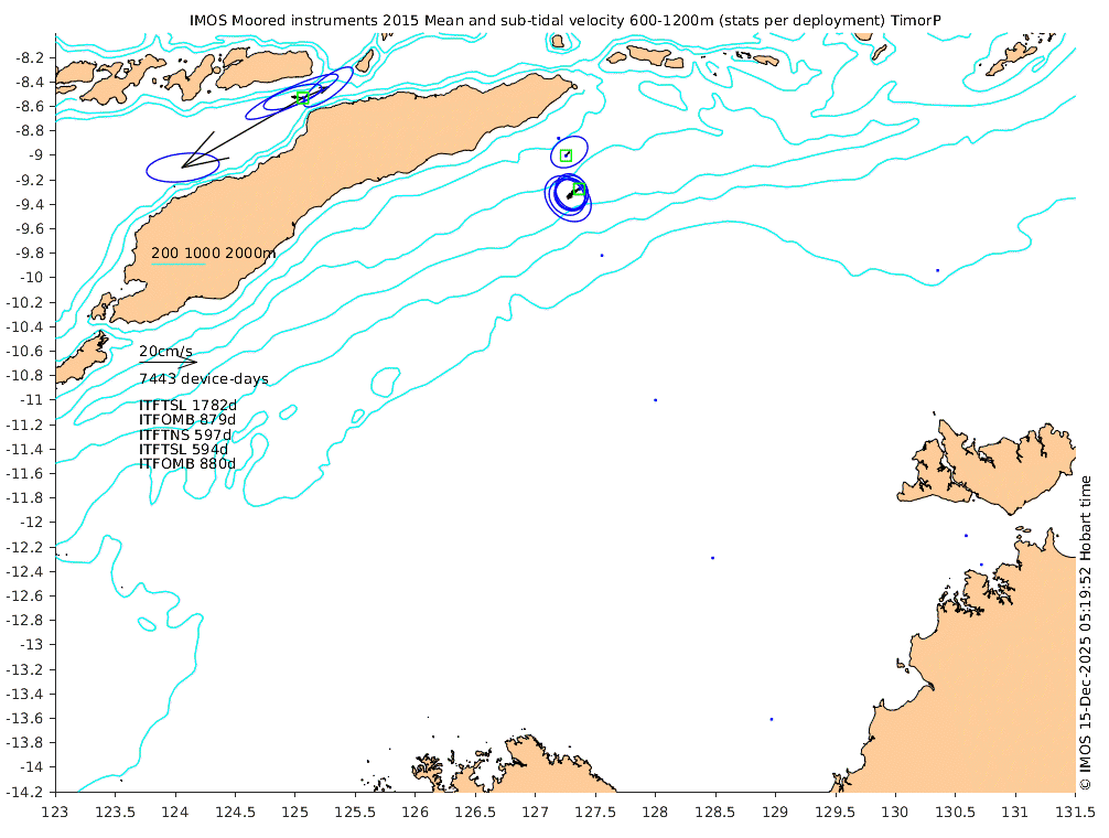 These maps show some basic analyses of the velocity data: mean (all-time in black and seasonal in colour) and sub-tidal variance for several layers and time-windows, and tidal harmonics for the depth-average velocity using the whole record. Click through to see more detailed plots of the selected dataset or to download those data from the AODN thredds server.