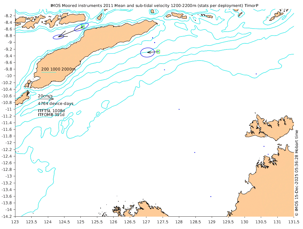 These maps show some basic analyses of the velocity data: mean (all-time in black and seasonal in colour) and sub-tidal variance for several layers and time-windows, and tidal harmonics for the depth-average velocity using the whole record. Click through to see more detailed plots of the selected dataset or to download those data from the AODN thredds server.