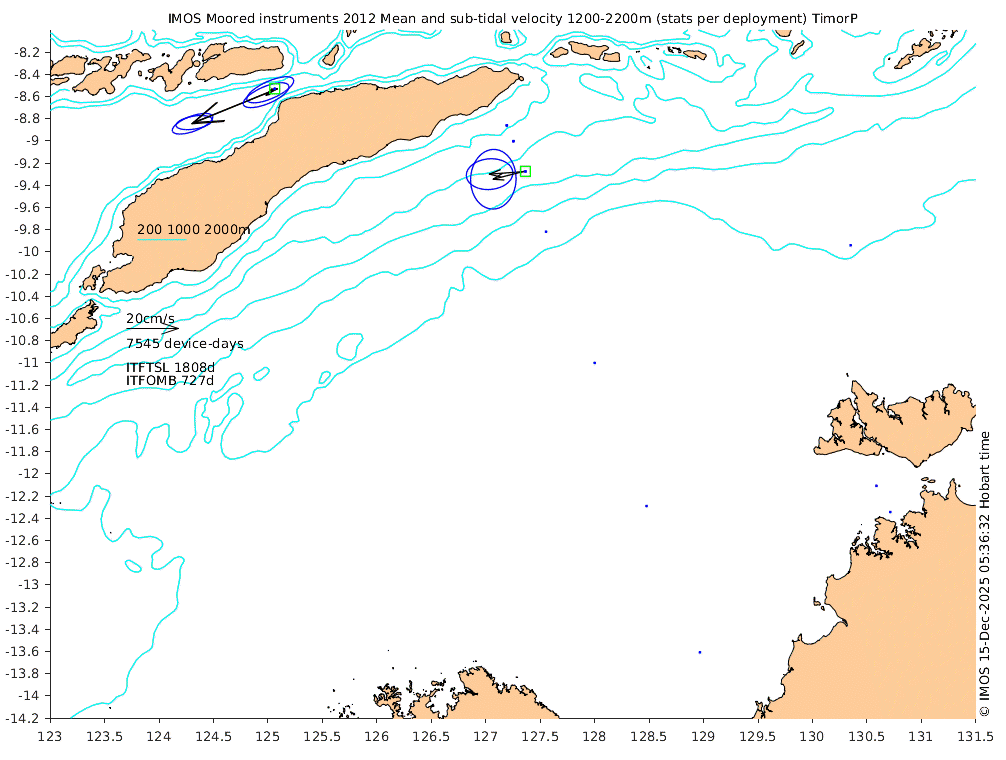These maps show some basic analyses of the velocity data: mean (all-time in black and seasonal in colour) and sub-tidal variance for several layers and time-windows, and tidal harmonics for the depth-average velocity using the whole record. Click through to see more detailed plots of the selected dataset or to download those data from the AODN thredds server.