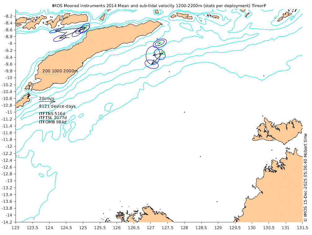 These maps show some basic analyses of the velocity data: mean (all-time in black and seasonal in colour) and sub-tidal variance for several layers and time-windows, and tidal harmonics for the depth-average velocity using the whole record. Click through to see more detailed plots of the selected dataset or to download those data from the AODN thredds server.