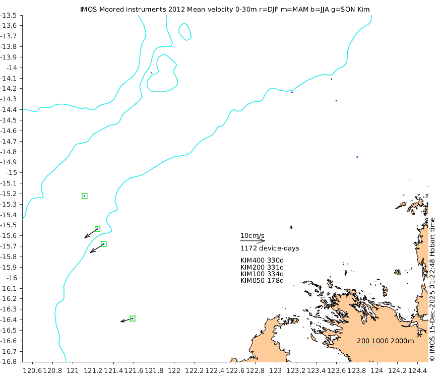 These maps show some basic analyses of the velocity data: mean (all-time in black and seasonal in colour) and sub-tidal variance for several layers and time-windows, and tidal harmonics for the depth-average velocity using the whole record. Click through to see more detailed plots of the selected dataset or to download those data from the AODN thredds server.