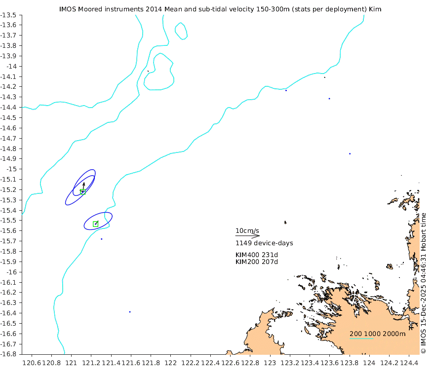 These maps show some basic analyses of the velocity data: mean (all-time in black and seasonal in colour) and sub-tidal variance for several layers and time-windows, and tidal harmonics for the depth-average velocity using the whole record. Click through to see more detailed plots of the selected dataset or to download those data from the AODN thredds server.