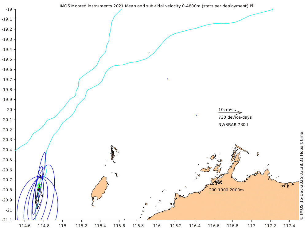 These maps show some basic analyses of the velocity data: mean (all-time in black and seasonal in colour) and sub-tidal variance for several layers and time-windows, and tidal harmonics for the depth-average velocity using the whole record. Click through to see more detailed plots of the selected dataset or to download those data from the AODN thredds server.
