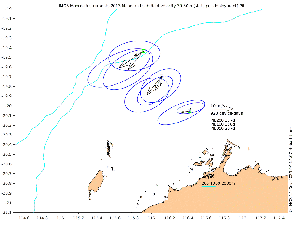 These maps show some basic analyses of the velocity data: mean (all-time in black and seasonal in colour) and sub-tidal variance for several layers and time-windows, and tidal harmonics for the depth-average velocity using the whole record. Click through to see more detailed plots of the selected dataset or to download those data from the AODN thredds server.