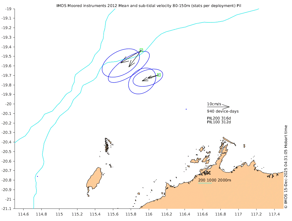 These maps show some basic analyses of the velocity data: mean (all-time in black and seasonal in colour) and sub-tidal variance for several layers and time-windows, and tidal harmonics for the depth-average velocity using the whole record. Click through to see more detailed plots of the selected dataset or to download those data from the AODN thredds server.