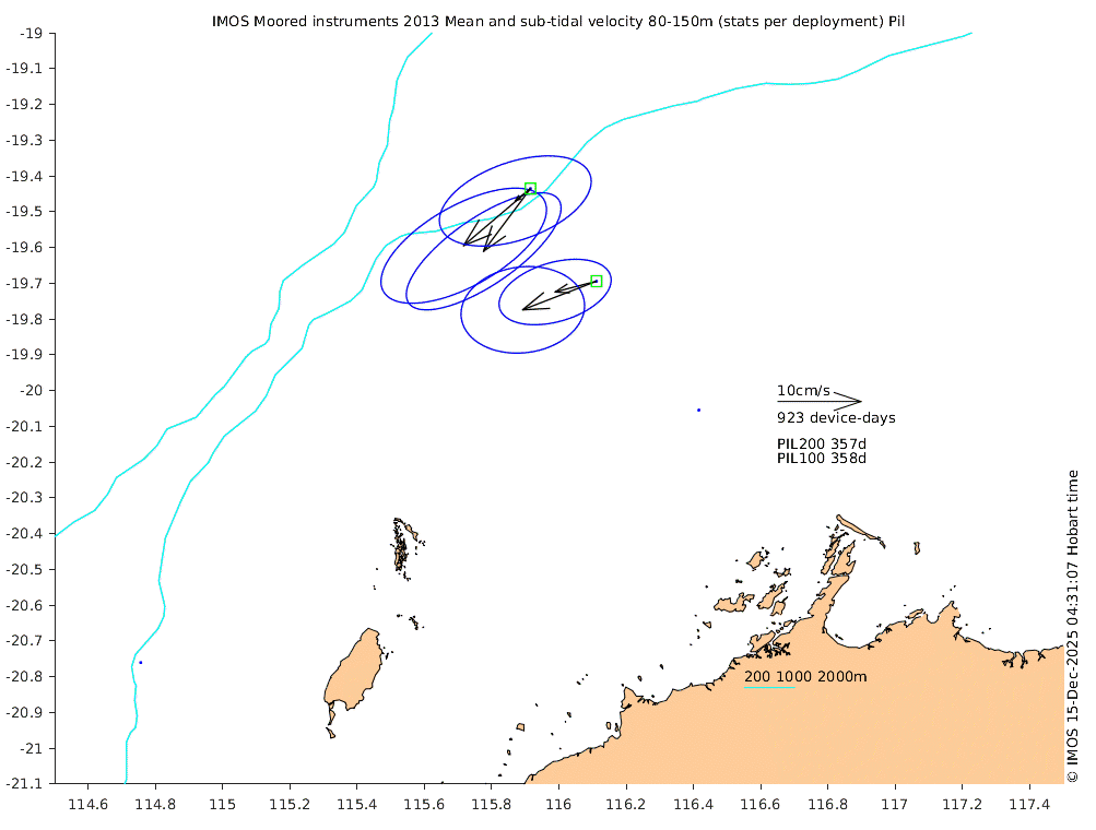 These maps show some basic analyses of the velocity data: mean (all-time in black and seasonal in colour) and sub-tidal variance for several layers and time-windows, and tidal harmonics for the depth-average velocity using the whole record. Click through to see more detailed plots of the selected dataset or to download those data from the AODN thredds server.