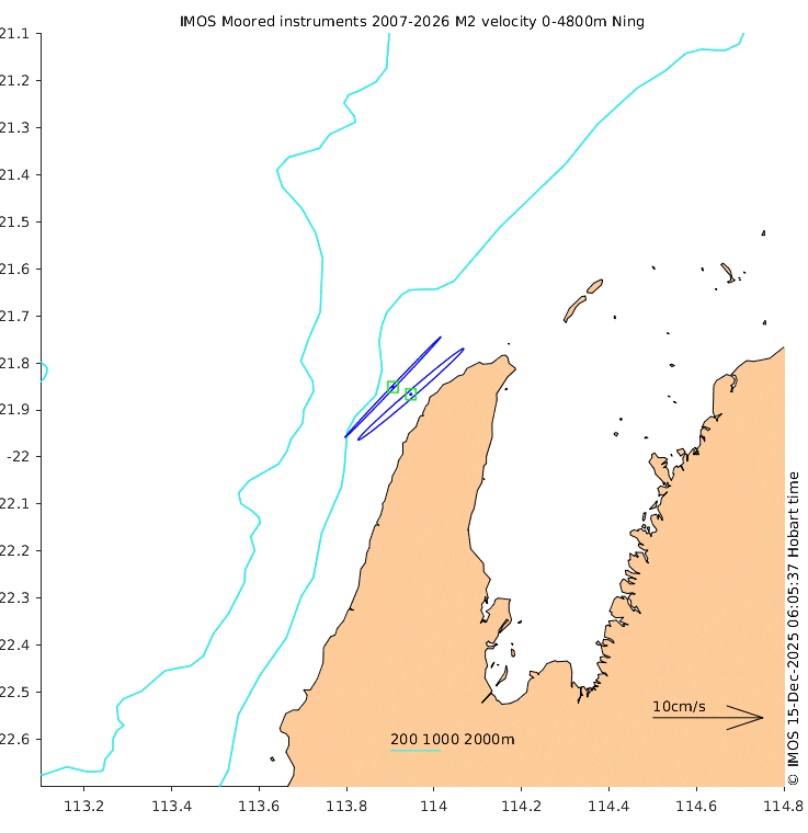 These maps show some basic analyses of the velocity data: mean (all-time in black and seasonal in colour) and sub-tidal variance for several layers and time-windows, and tidal harmonics for the depth-average velocity using the whole record. Click through to see more detailed plots of the selected dataset or to download those data from the AODN thredds server.