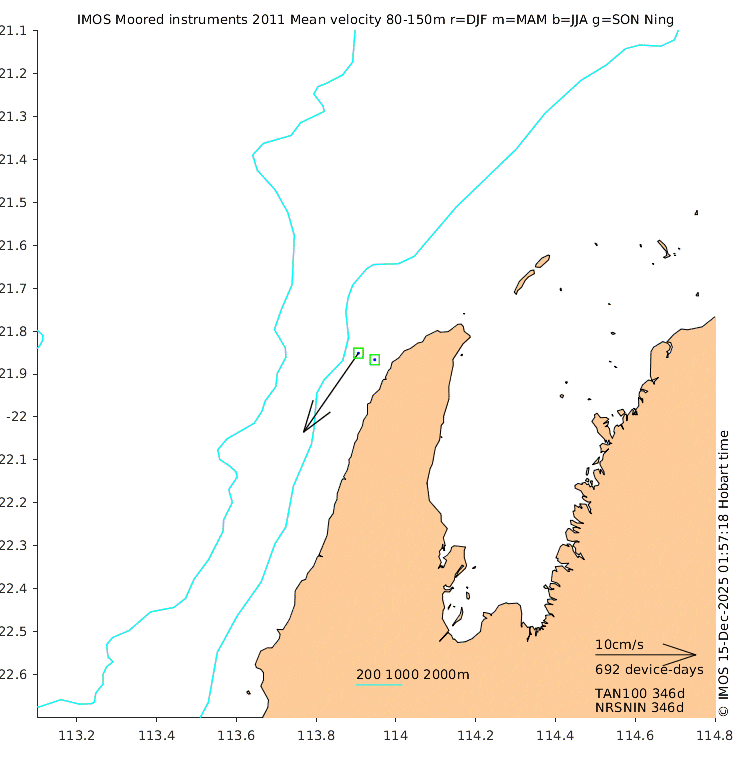 These maps show some basic analyses of the velocity data: mean (all-time in black and seasonal in colour) and sub-tidal variance for several layers and time-windows, and tidal harmonics for the depth-average velocity using the whole record. Click through to see more detailed plots of the selected dataset or to download those data from the AODN thredds server.