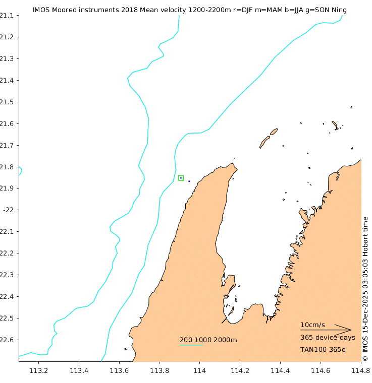 These maps show some basic analyses of the velocity data: mean (all-time in black and seasonal in colour) and sub-tidal variance for several layers and time-windows, and tidal harmonics for the depth-average velocity using the whole record. Click through to see more detailed plots of the selected dataset or to download those data from the AODN thredds server.