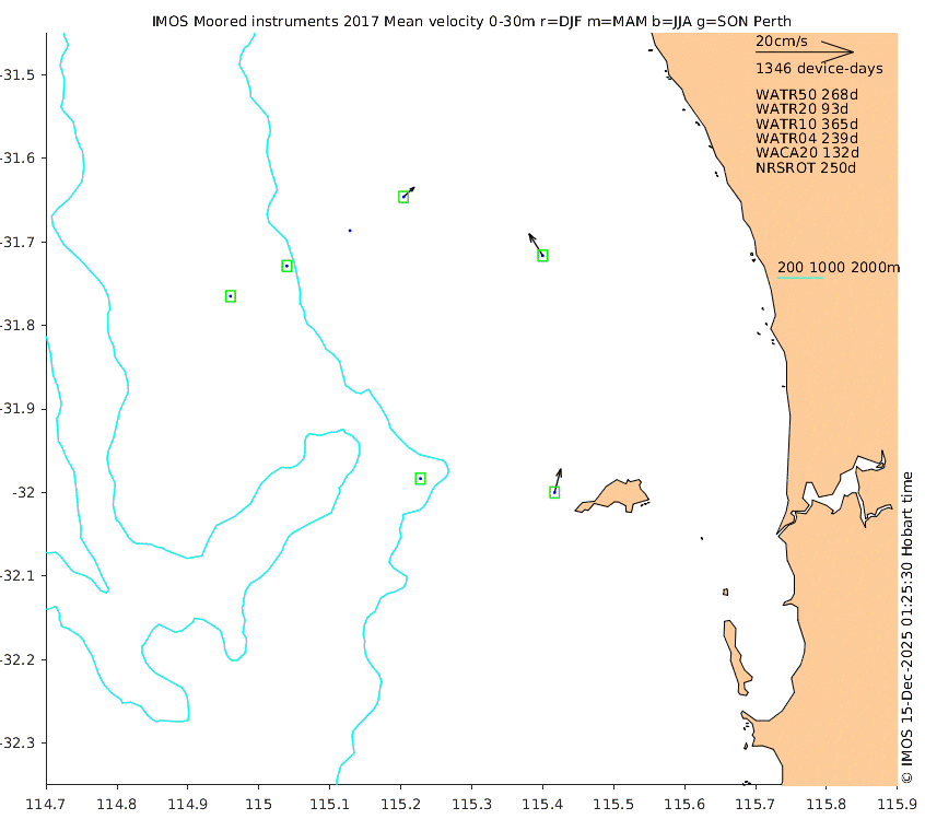 These maps show some basic analyses of the velocity data: mean (all-time in black and seasonal in colour) and sub-tidal variance for several layers and time-windows, and tidal harmonics for the depth-average velocity using the whole record. Click through to see more detailed plots of the selected dataset or to download those data from the AODN thredds server.