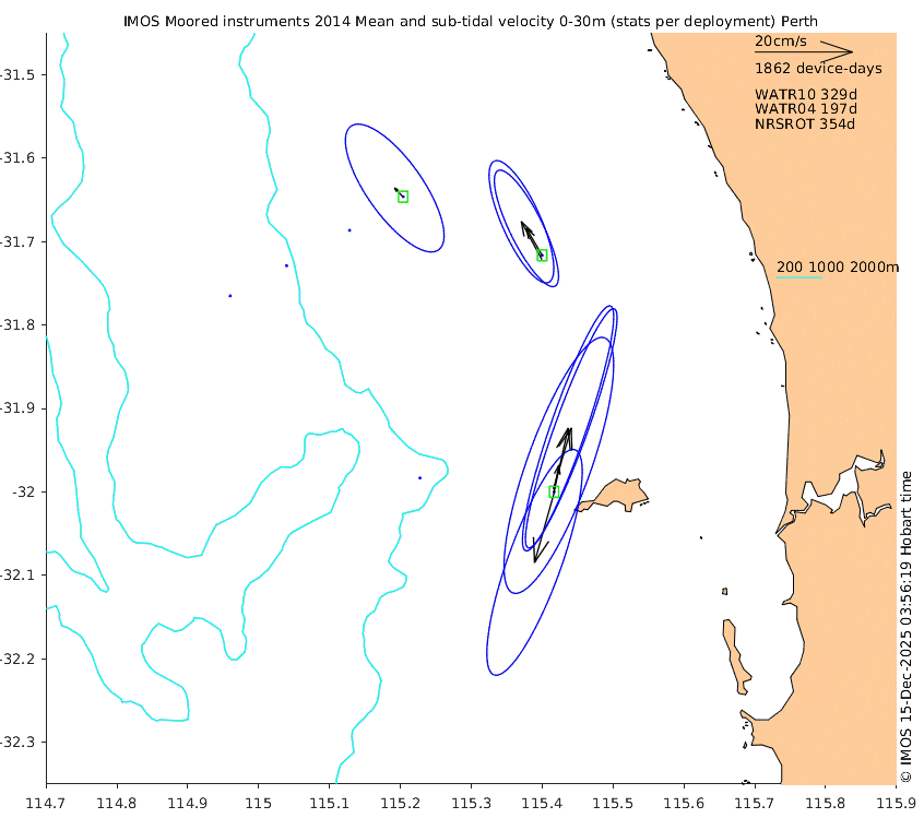 These maps show some basic analyses of the velocity data: mean (all-time in black and seasonal in colour) and sub-tidal variance for several layers and time-windows, and tidal harmonics for the depth-average velocity using the whole record. Click through to see more detailed plots of the selected dataset or to download those data from the AODN thredds server.