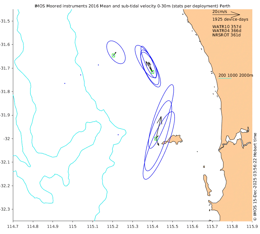 These maps show some basic analyses of the velocity data: mean (all-time in black and seasonal in colour) and sub-tidal variance for several layers and time-windows, and tidal harmonics for the depth-average velocity using the whole record. Click through to see more detailed plots of the selected dataset or to download those data from the AODN thredds server.