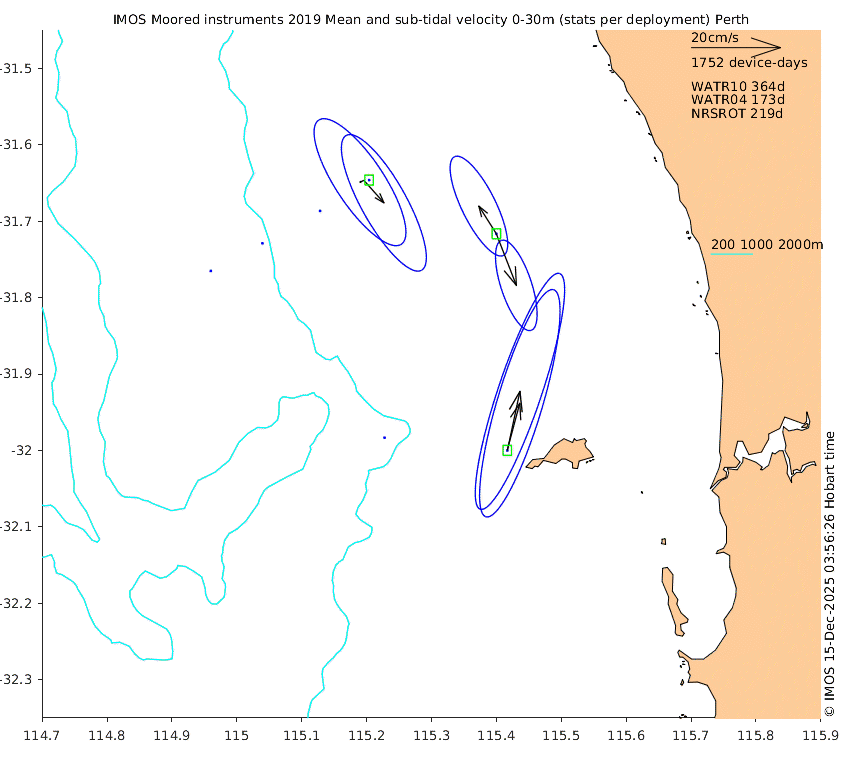 These maps show some basic analyses of the velocity data: mean (all-time in black and seasonal in colour) and sub-tidal variance for several layers and time-windows, and tidal harmonics for the depth-average velocity using the whole record. Click through to see more detailed plots of the selected dataset or to download those data from the AODN thredds server.