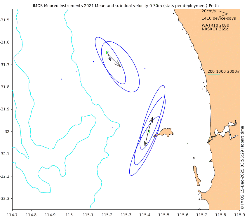 These maps show some basic analyses of the velocity data: mean (all-time in black and seasonal in colour) and sub-tidal variance for several layers and time-windows, and tidal harmonics for the depth-average velocity using the whole record. Click through to see more detailed plots of the selected dataset or to download those data from the AODN thredds server.