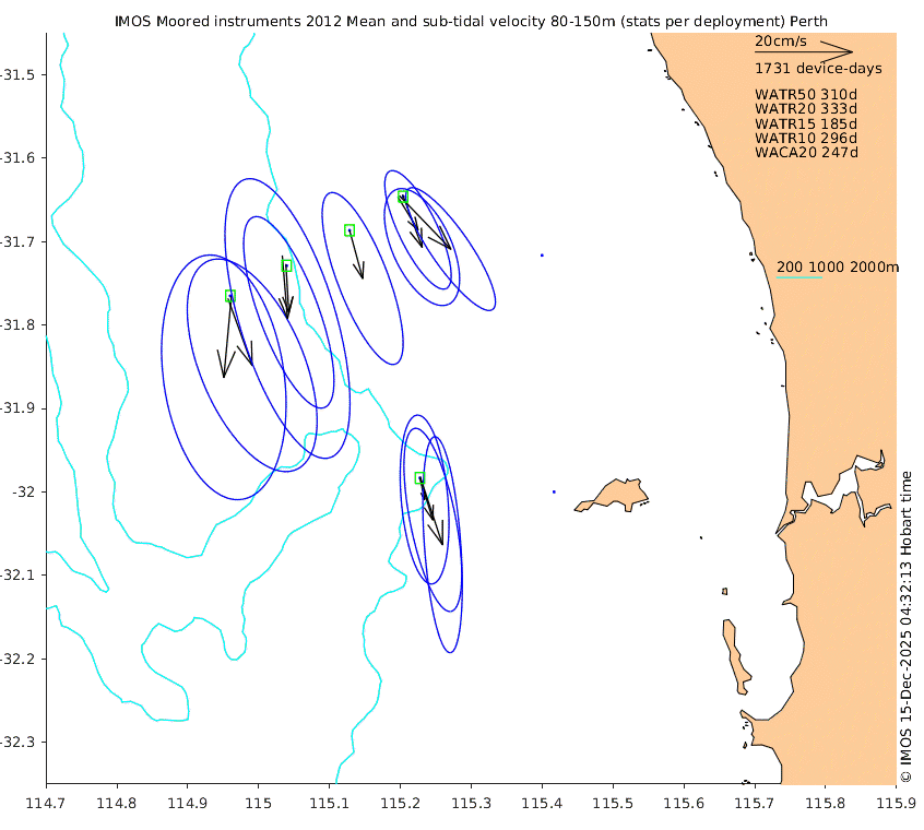 These maps show some basic analyses of the velocity data: mean (all-time in black and seasonal in colour) and sub-tidal variance for several layers and time-windows, and tidal harmonics for the depth-average velocity using the whole record. Click through to see more detailed plots of the selected dataset or to download those data from the AODN thredds server.