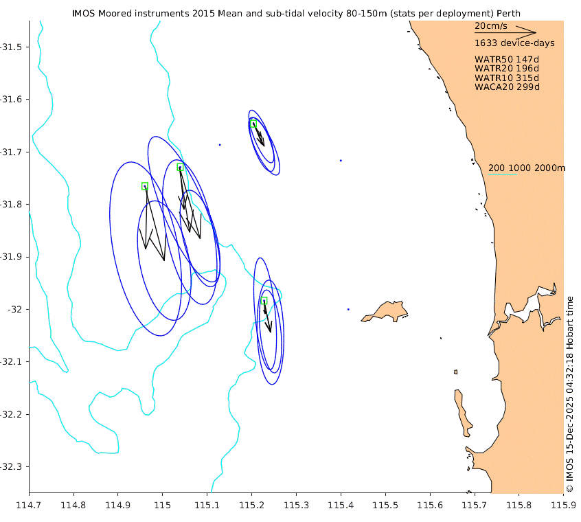 These maps show some basic analyses of the velocity data: mean (all-time in black and seasonal in colour) and sub-tidal variance for several layers and time-windows, and tidal harmonics for the depth-average velocity using the whole record. Click through to see more detailed plots of the selected dataset or to download those data from the AODN thredds server.