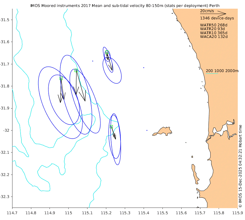 These maps show some basic analyses of the velocity data: mean (all-time in black and seasonal in colour) and sub-tidal variance for several layers and time-windows, and tidal harmonics for the depth-average velocity using the whole record. Click through to see more detailed plots of the selected dataset or to download those data from the AODN thredds server.