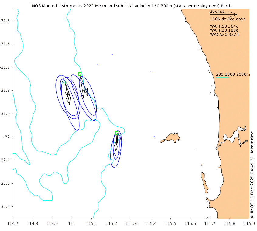 These maps show some basic analyses of the velocity data: mean (all-time in black and seasonal in colour) and sub-tidal variance for several layers and time-windows, and tidal harmonics for the depth-average velocity using the whole record. Click through to see more detailed plots of the selected dataset or to download those data from the AODN thredds server.