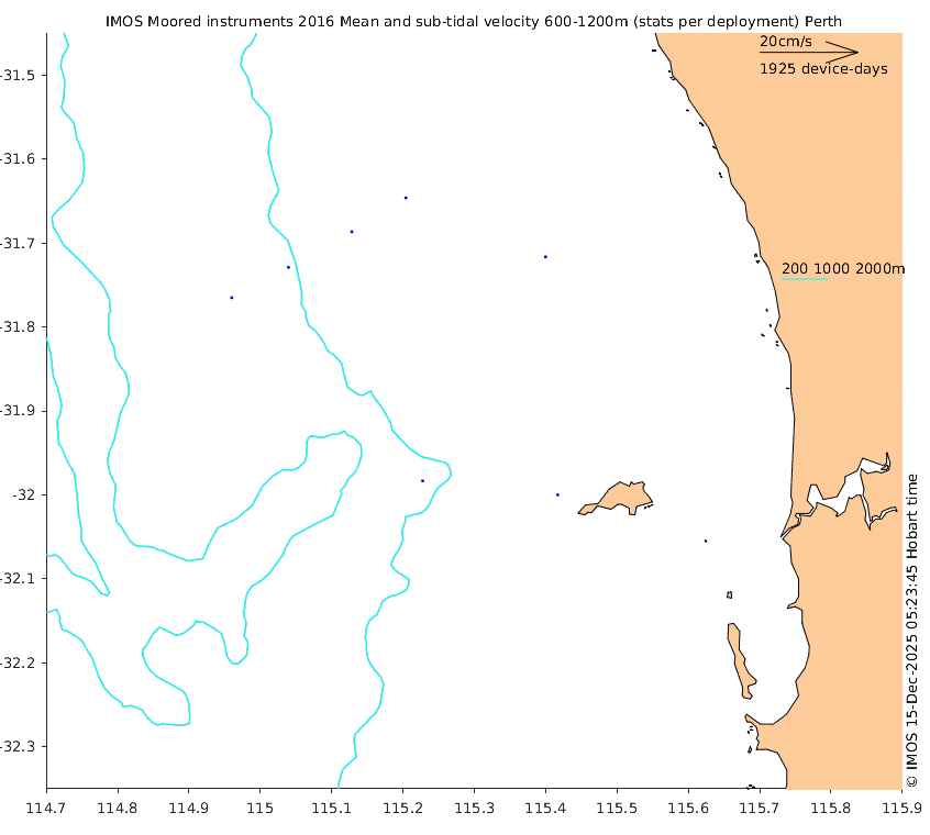 These maps show some basic analyses of the velocity data: mean (all-time in black and seasonal in colour) and sub-tidal variance for several layers and time-windows, and tidal harmonics for the depth-average velocity using the whole record. Click through to see more detailed plots of the selected dataset or to download those data from the AODN thredds server.