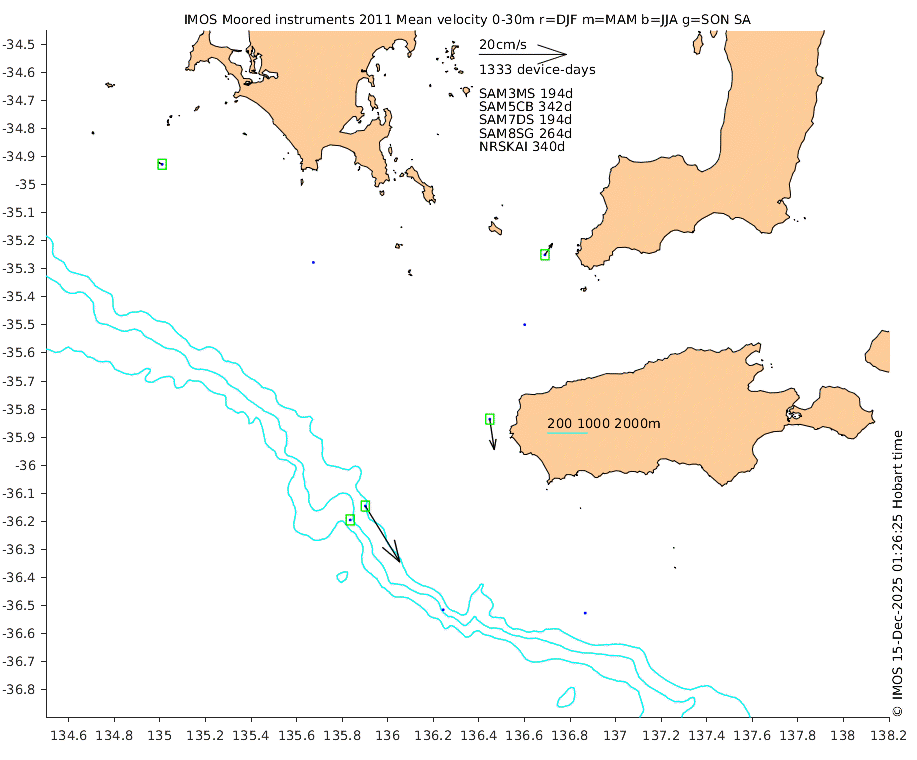 These maps show some basic analyses of the velocity data: mean (all-time in black and seasonal in colour) and sub-tidal variance for several layers and time-windows, and tidal harmonics for the depth-average velocity using the whole record. Click through to see more detailed plots of the selected dataset or to download those data from the AODN thredds server.