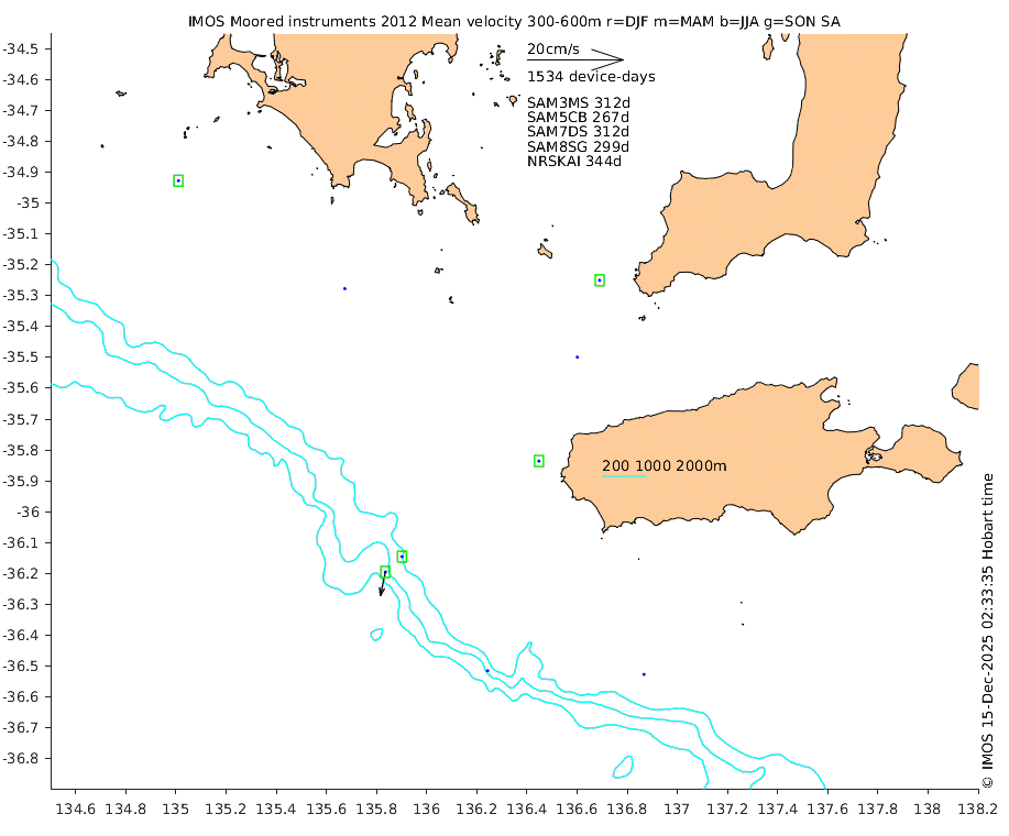 These maps show some basic analyses of the velocity data: mean (all-time in black and seasonal in colour) and sub-tidal variance for several layers and time-windows, and tidal harmonics for the depth-average velocity using the whole record. Click through to see more detailed plots of the selected dataset or to download those data from the AODN thredds server.