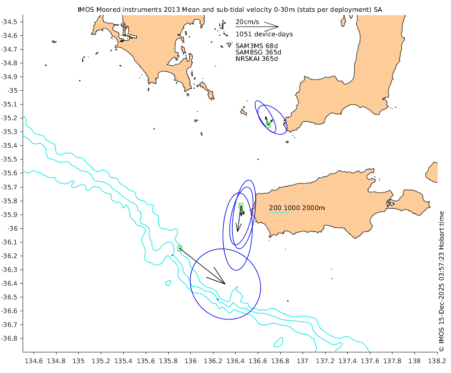 These maps show some basic analyses of the velocity data: mean (all-time in black and seasonal in colour) and sub-tidal variance for several layers and time-windows, and tidal harmonics for the depth-average velocity using the whole record. Click through to see more detailed plots of the selected dataset or to download those data from the AODN thredds server.