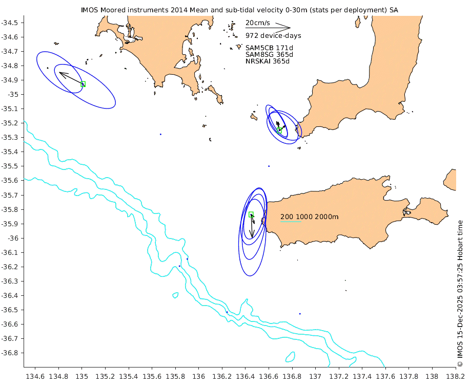 These maps show some basic analyses of the velocity data: mean (all-time in black and seasonal in colour) and sub-tidal variance for several layers and time-windows, and tidal harmonics for the depth-average velocity using the whole record. Click through to see more detailed plots of the selected dataset or to download those data from the AODN thredds server.
