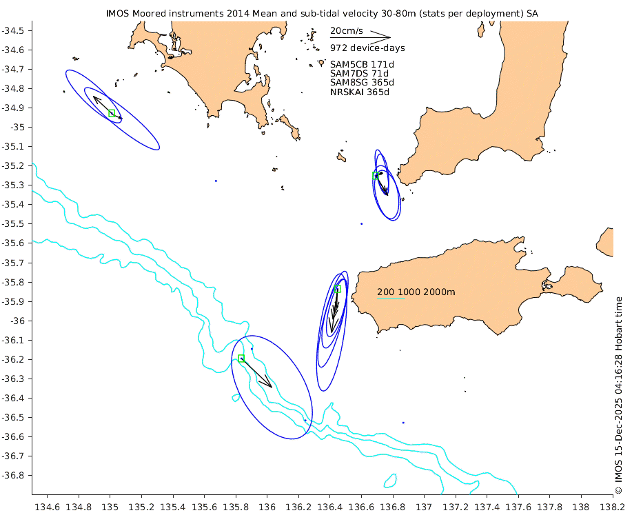 These maps show some basic analyses of the velocity data: mean (all-time in black and seasonal in colour) and sub-tidal variance for several layers and time-windows, and tidal harmonics for the depth-average velocity using the whole record. Click through to see more detailed plots of the selected dataset or to download those data from the AODN thredds server.