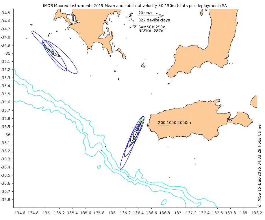 These maps show some basic analyses of the velocity data: mean (all-time in black and seasonal in colour) and sub-tidal variance for several layers and time-windows, and tidal harmonics for the depth-average velocity using the whole record. Click through to see more detailed plots of the selected dataset or to download those data from the AODN thredds server.