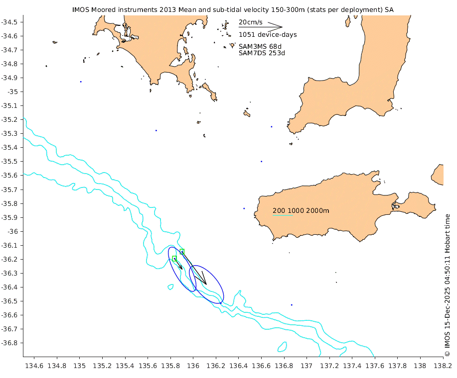 These maps show some basic analyses of the velocity data: mean (all-time in black and seasonal in colour) and sub-tidal variance for several layers and time-windows, and tidal harmonics for the depth-average velocity using the whole record. Click through to see more detailed plots of the selected dataset or to download those data from the AODN thredds server.
