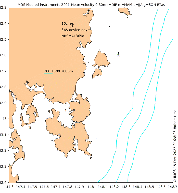 These maps show some basic analyses of the velocity data: mean (all-time in black and seasonal in colour) and sub-tidal variance for several layers and time-windows, and tidal harmonics for the depth-average velocity using the whole record. Click through to see more detailed plots of the selected dataset or to download those data from the AODN thredds server.