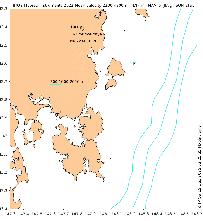 These maps show some basic analyses of the velocity data: mean (all-time in black and seasonal in colour) and sub-tidal variance for several layers and time-windows, and tidal harmonics for the depth-average velocity using the whole record. Click through to see more detailed plots of the selected dataset or to download those data from the AODN thredds server.