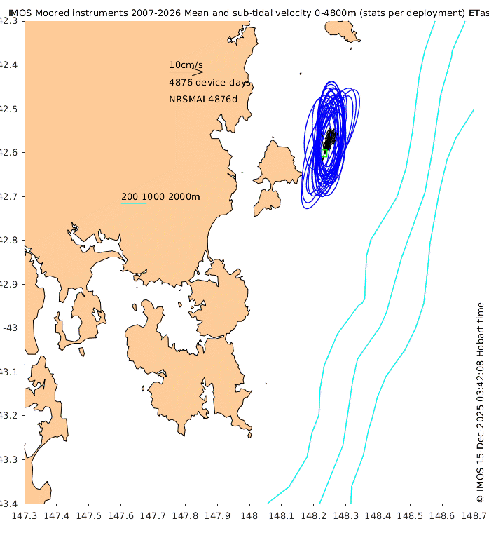 These maps show some basic analyses of the velocity data: mean (all-time in black and seasonal in colour) and sub-tidal variance for several layers and time-windows, and tidal harmonics for the depth-average velocity using the whole record. Click through to see more detailed plots of the selected dataset or to download those data from the AODN thredds server.