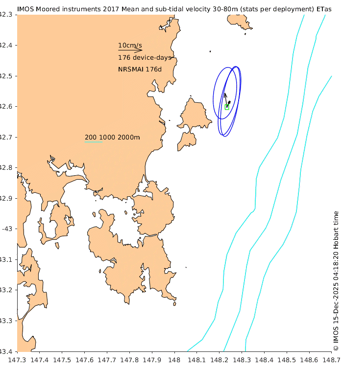 These maps show some basic analyses of the velocity data: mean (all-time in black and seasonal in colour) and sub-tidal variance for several layers and time-windows, and tidal harmonics for the depth-average velocity using the whole record. Click through to see more detailed plots of the selected dataset or to download those data from the AODN thredds server.