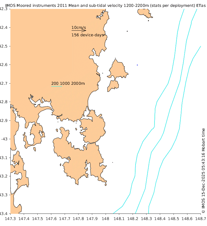 These maps show some basic analyses of the velocity data: mean (all-time in black and seasonal in colour) and sub-tidal variance for several layers and time-windows, and tidal harmonics for the depth-average velocity using the whole record. Click through to see more detailed plots of the selected dataset or to download those data from the AODN thredds server.