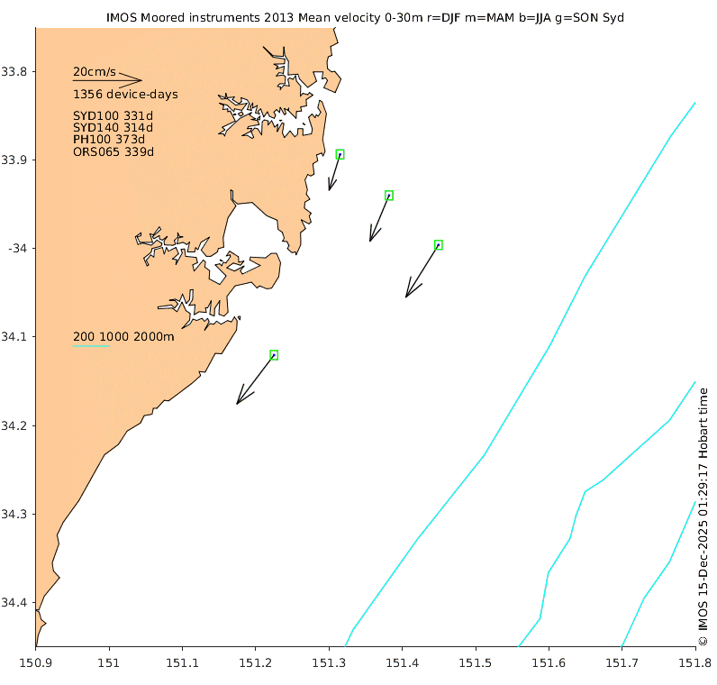 These maps show some basic analyses of the velocity data: mean (all-time in black and seasonal in colour) and sub-tidal variance for several layers and time-windows, and tidal harmonics for the depth-average velocity using the whole record. Click through to see more detailed plots of the selected dataset or to download those data from the AODN thredds server.
