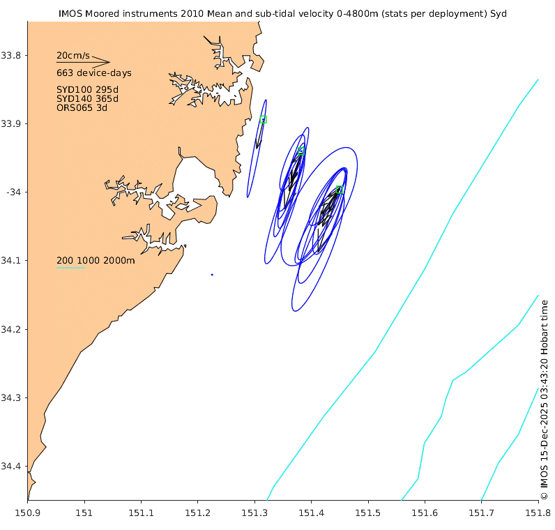 These maps show some basic analyses of the velocity data: mean (all-time in black and seasonal in colour) and sub-tidal variance for several layers and time-windows, and tidal harmonics for the depth-average velocity using the whole record. Click through to see more detailed plots of the selected dataset or to download those data from the AODN thredds server.