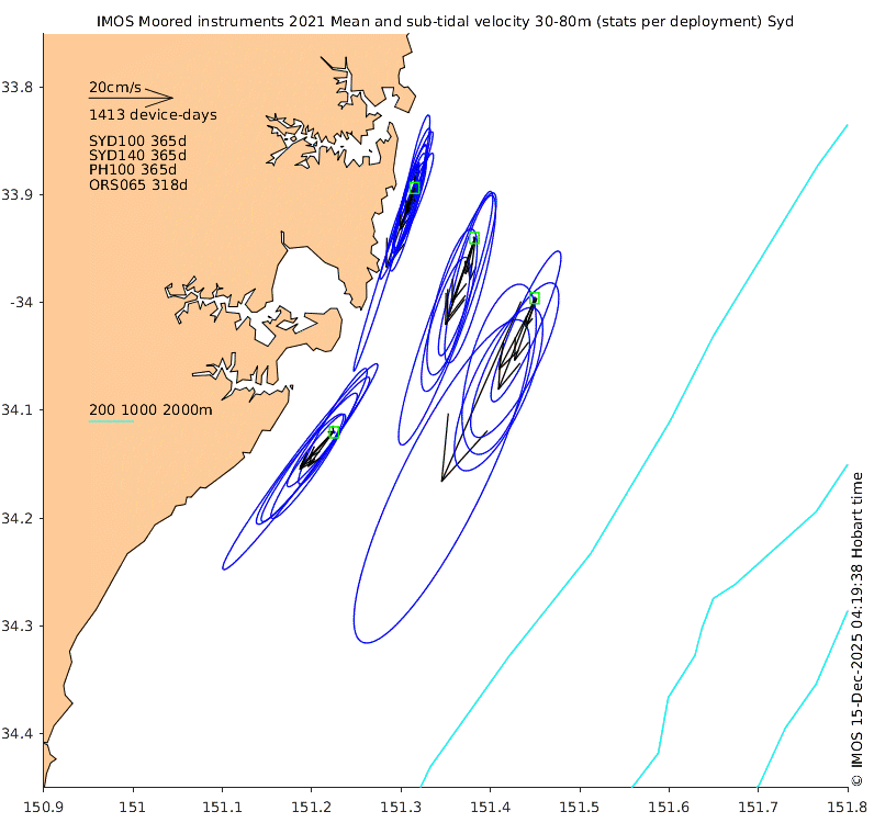 These maps show some basic analyses of the velocity data: mean (all-time in black and seasonal in colour) and sub-tidal variance for several layers and time-windows, and tidal harmonics for the depth-average velocity using the whole record. Click through to see more detailed plots of the selected dataset or to download those data from the AODN thredds server.