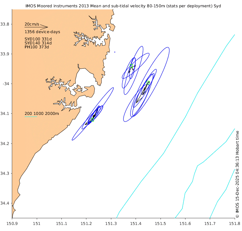 These maps show some basic analyses of the velocity data: mean (all-time in black and seasonal in colour) and sub-tidal variance for several layers and time-windows, and tidal harmonics for the depth-average velocity using the whole record. Click through to see more detailed plots of the selected dataset or to download those data from the AODN thredds server.