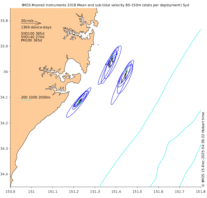 These maps show some basic analyses of the velocity data: mean (all-time in black and seasonal in colour) and sub-tidal variance for several layers and time-windows, and tidal harmonics for the depth-average velocity using the whole record. Click through to see more detailed plots of the selected dataset or to download those data from the AODN thredds server.