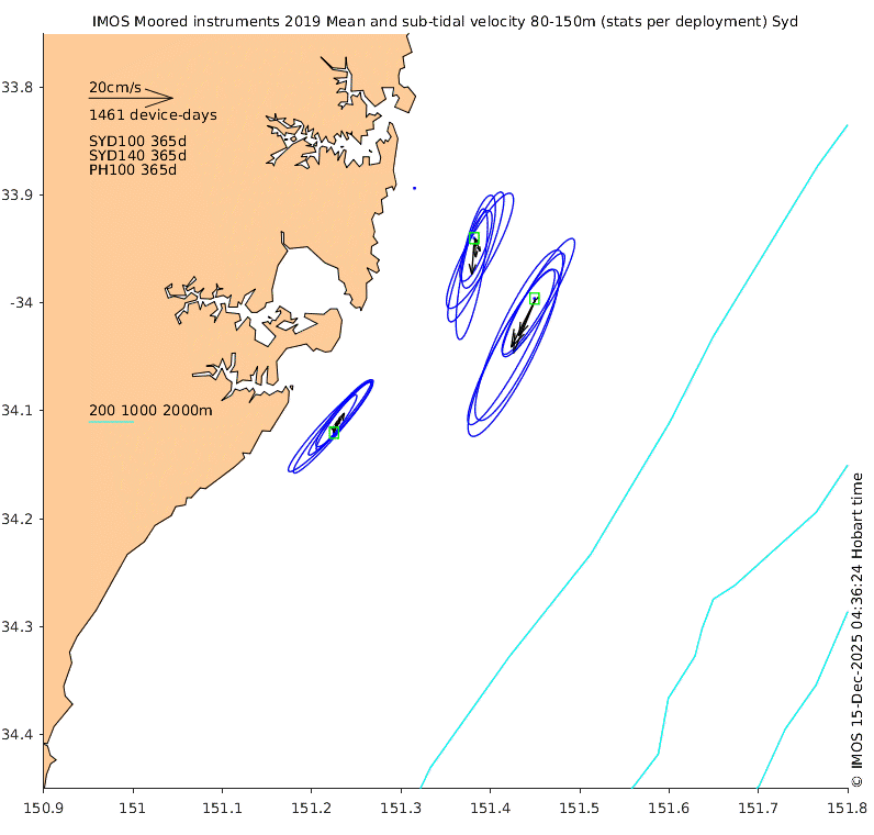These maps show some basic analyses of the velocity data: mean (all-time in black and seasonal in colour) and sub-tidal variance for several layers and time-windows, and tidal harmonics for the depth-average velocity using the whole record. Click through to see more detailed plots of the selected dataset or to download those data from the AODN thredds server.
