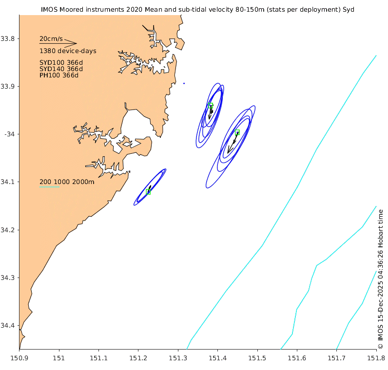 These maps show some basic analyses of the velocity data: mean (all-time in black and seasonal in colour) and sub-tidal variance for several layers and time-windows, and tidal harmonics for the depth-average velocity using the whole record. Click through to see more detailed plots of the selected dataset or to download those data from the AODN thredds server.