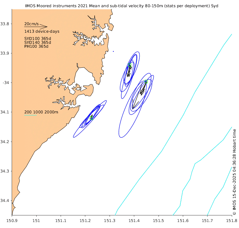 These maps show some basic analyses of the velocity data: mean (all-time in black and seasonal in colour) and sub-tidal variance for several layers and time-windows, and tidal harmonics for the depth-average velocity using the whole record. Click through to see more detailed plots of the selected dataset or to download those data from the AODN thredds server.